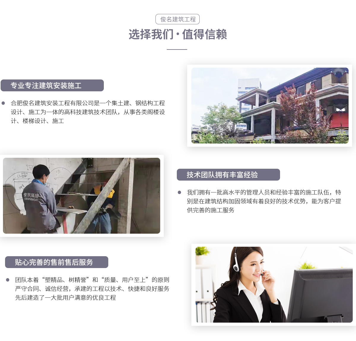- 合肥俊名建筑安裝工程有限公司是一個(gè)集土建、鋼結(jié)構(gòu)工程設(shè)計(jì)、施工為一體的高科技建筑技術(shù)團(tuán)隊(duì),從事各類閣樓設(shè)計(jì)、施工。我們擁有一批高水平的管理人員和經(jīng)驗(yàn)豐富的施工隊(duì)伍,特別是在建筑結(jié)構(gòu)加固領(lǐng)域有著良好的技術(shù)優(yōu)勢(shì)。團(tuán)隊(duì)員工精誠(chéng)團(tuán)結(jié),以“尊重規(guī)范,拒絕平凡”為宗旨,為客戶提供完善的施工服務(wù)。團(tuán)隊(duì)本著“塑精品、樹精譽(yù)”和“質(zhì)量、用戶至上”的原則,嚴(yán)守合同、誠(chéng)信經(jīng)營(yíng),所...